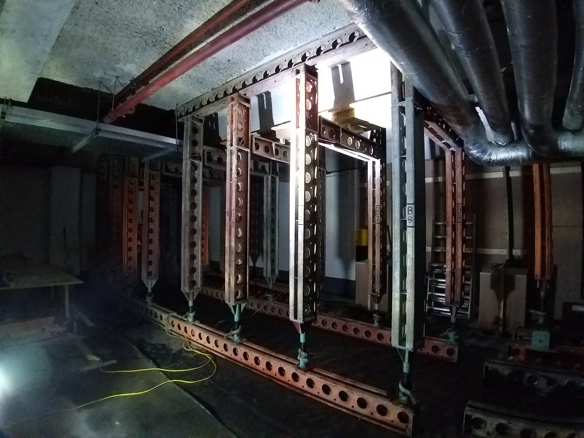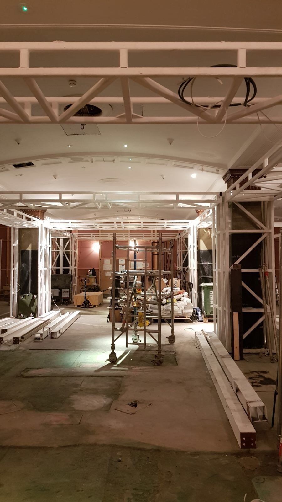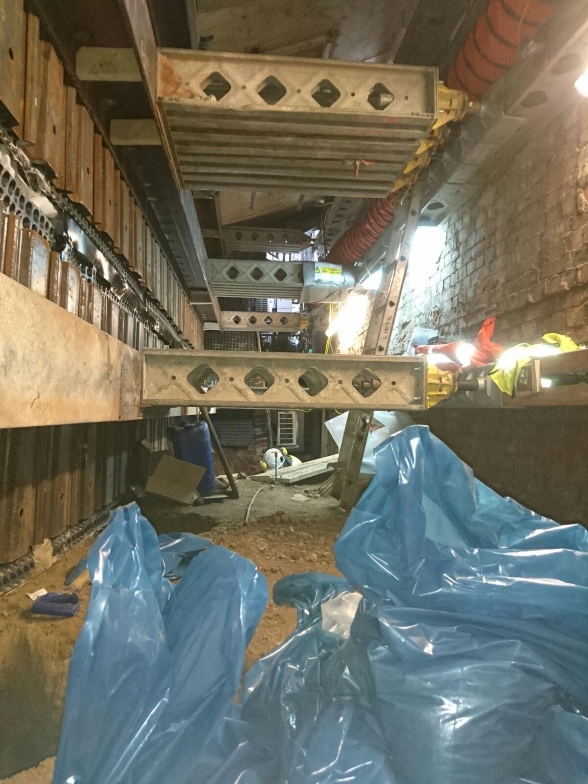 Works: Formation of escalator aperture and fitting trimmer steels, with the heaviest being 4 tonne. Various openings including a 16m long opening through 600mm thick brick wall. Supported one side only with a series of bespoke temporary props.